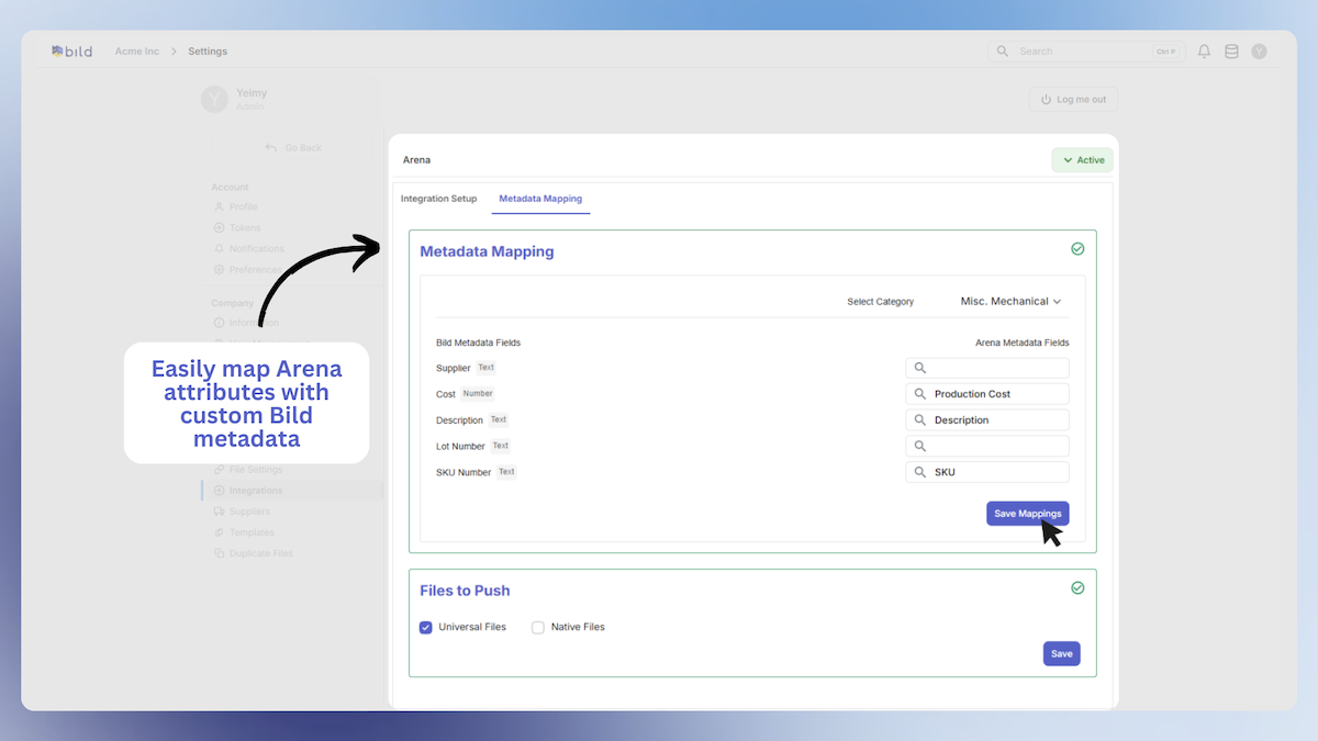 - Map metadata fields from Bild to Arena for synchronization and consistency of critical data attributes